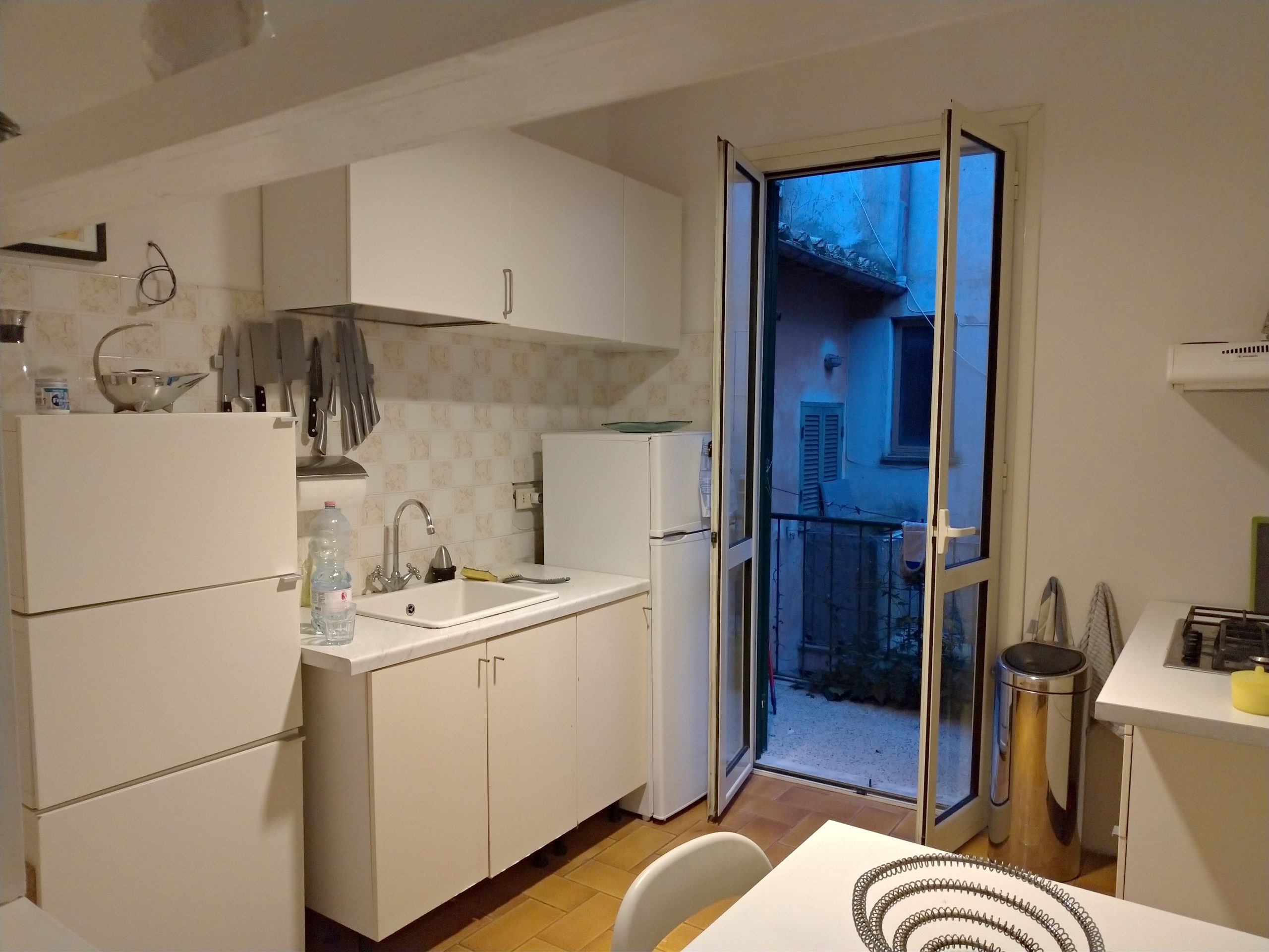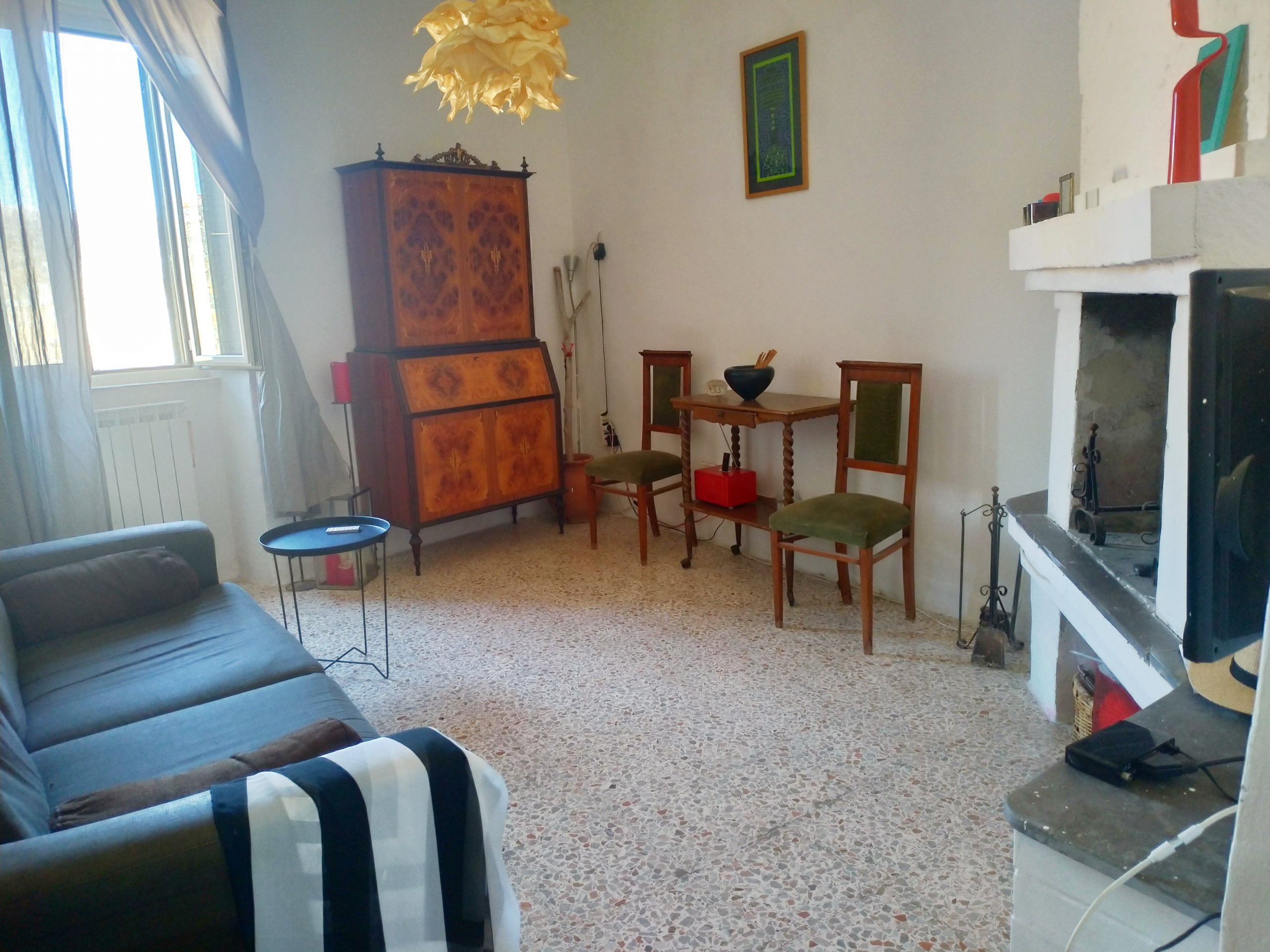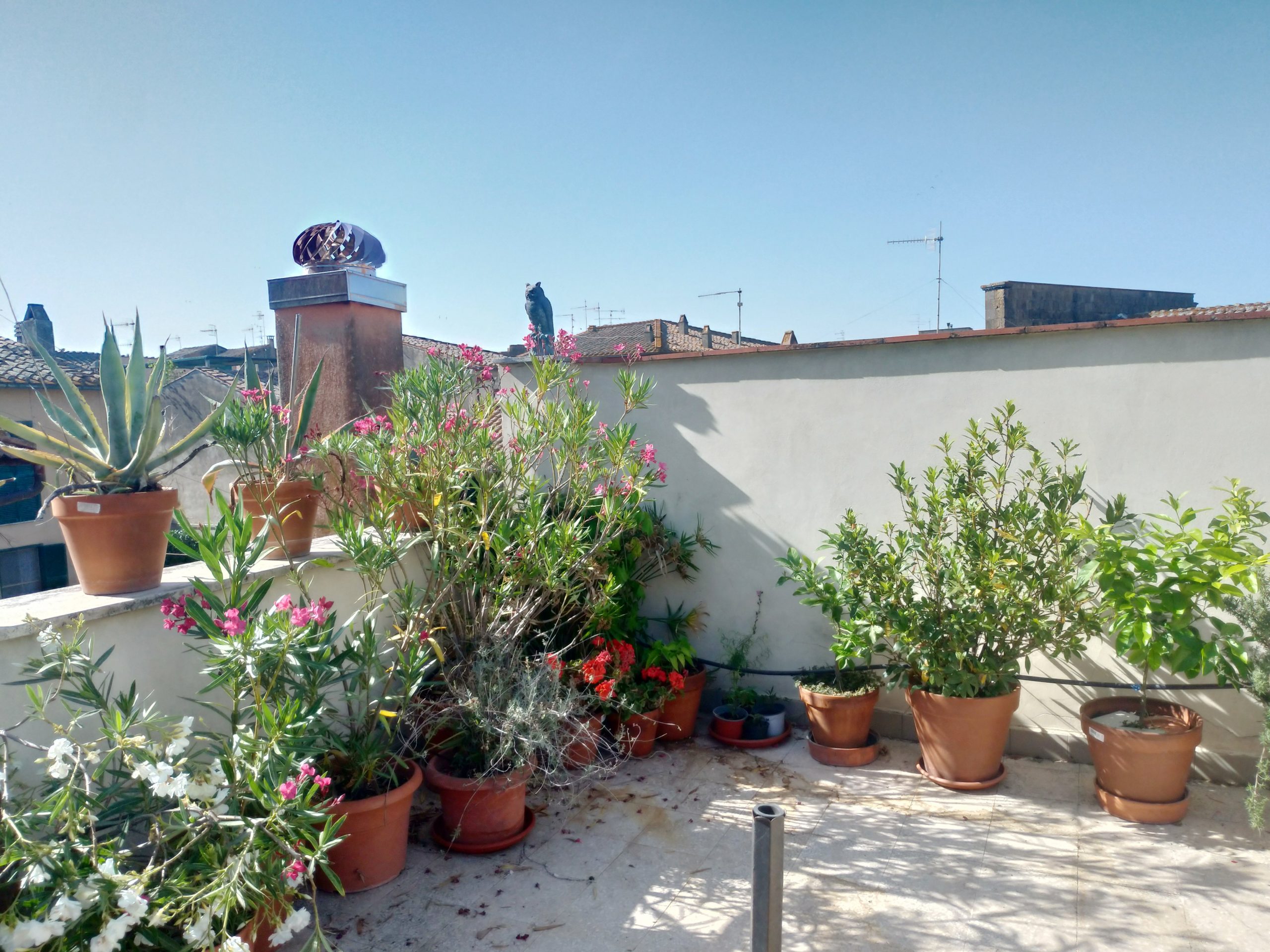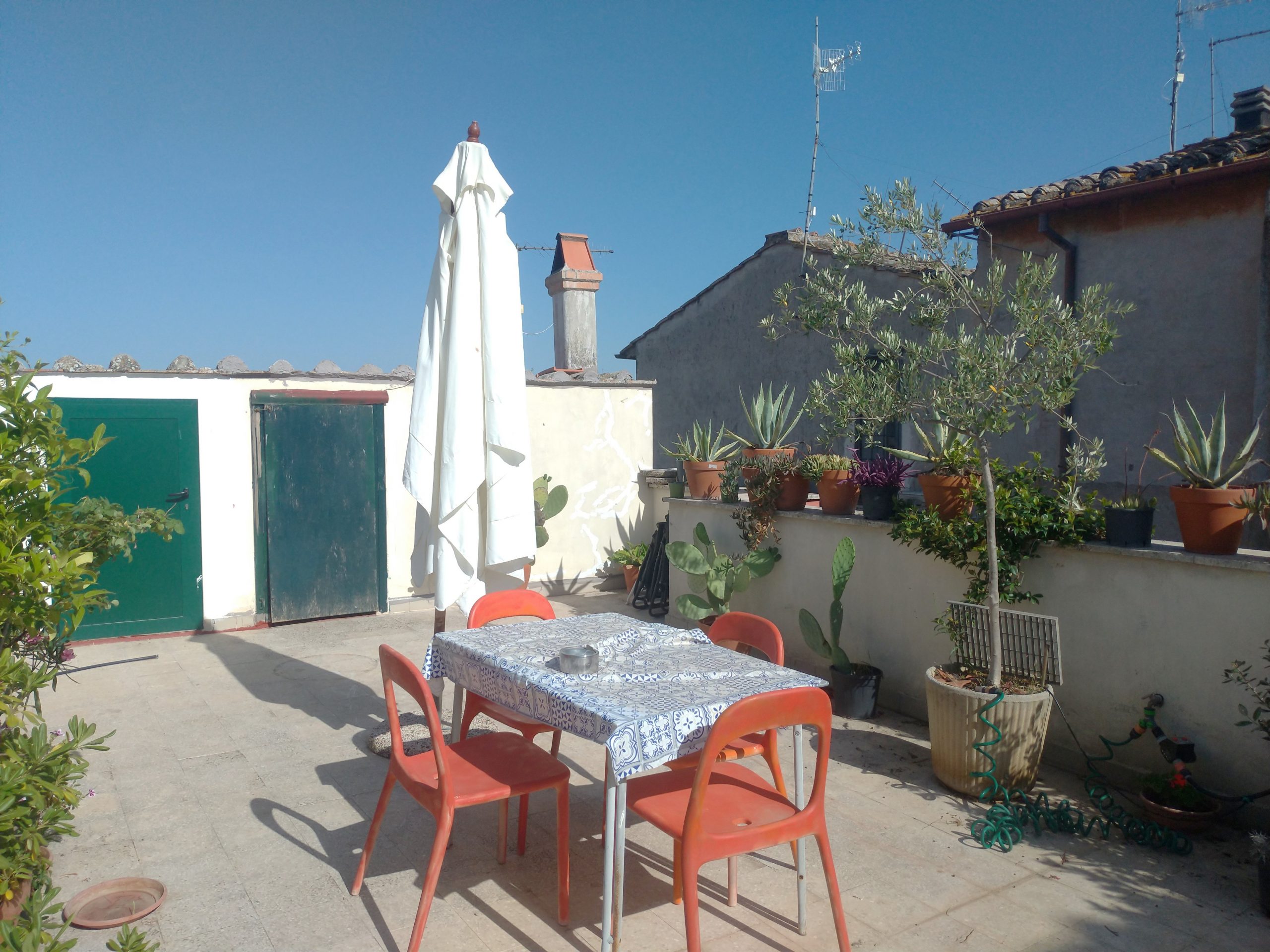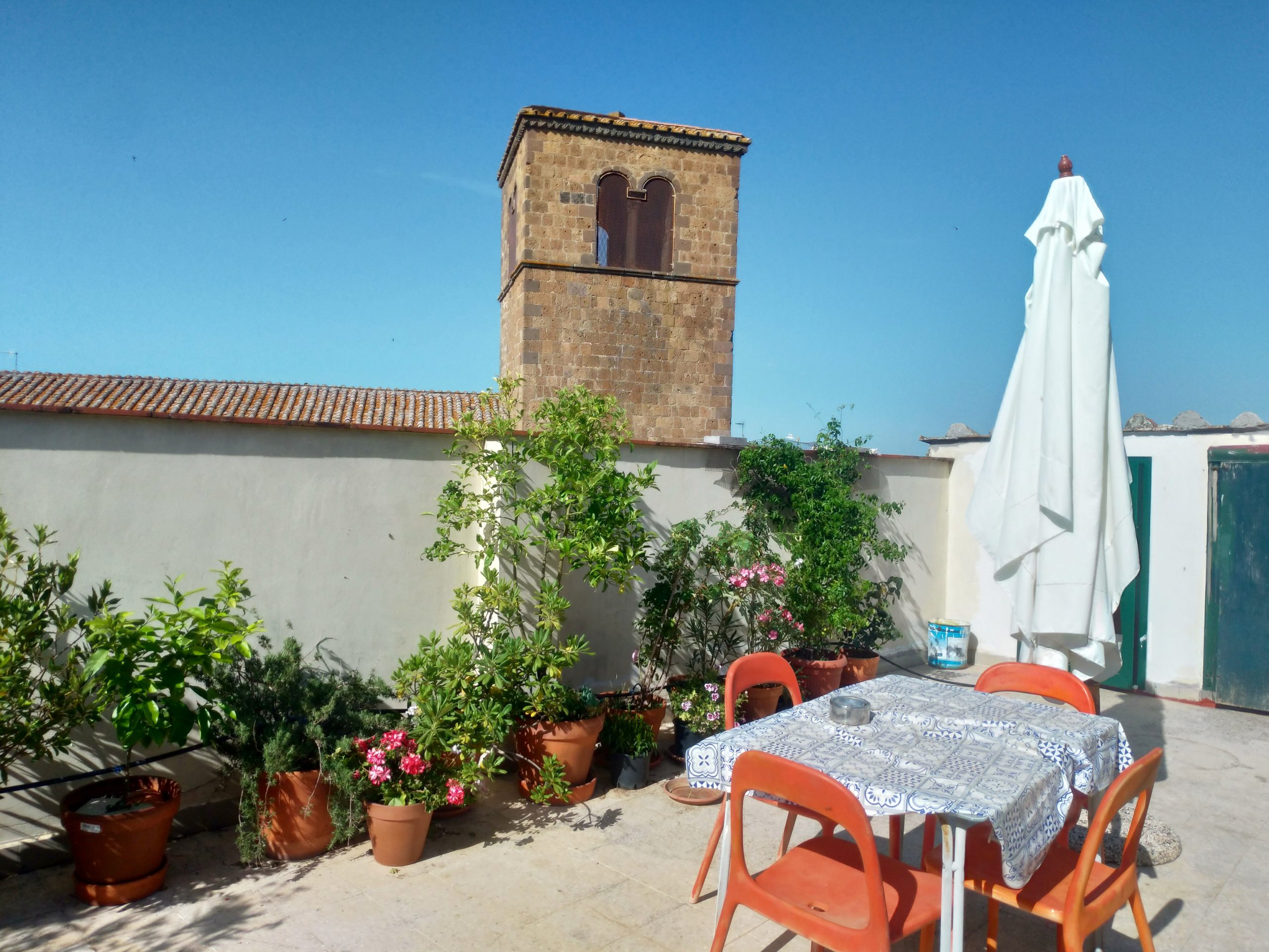 Tuscania, centro storico, nelle adiacenze del Monastero delle Clarisse, in una delle zone più alte del centro storico, proponiamo palazzetto cielo-terra con scoperto, balcone ed ampia terrazza. La superficie è divisa al piano terra in ingresso, ampio soggiorno/taverna con accesso diretto a scoperto privato di mq 23 ca con piccolo locale legnaia, al piano primo disimpegno, cucina abitabile con accesso a balcone, corridoio, camera matrimoniale, bagno con doccia e finestra, soggiorno con camino e scala di collegamento a terrazza di mq 40 ca al piano secondo e locale sottotetto. I pavimenti sono in gres simil cotto al piano terreno, parte in laminato e parte in segato di marmo al piano primo; gli infissi interni in alluminio bianco doppi vetri, esterni con persiane in alluminio, le porte interne in legno chiare, termoautonomo a metano. Terrazza al piano secondo molto luminosa. Ottima posizione.